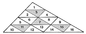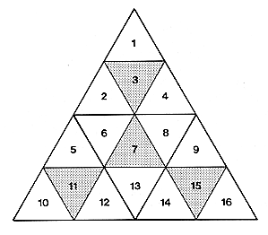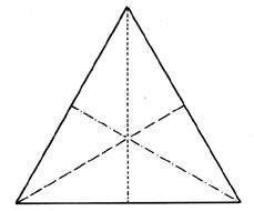 The equiangular triangle folds into a regular tetrahedron consisting of four similar, equivolume, regular tetrahedra. Their total volume equals the volume of the central octahedron (inadvertently described). (See Fig. 100.413.png.)