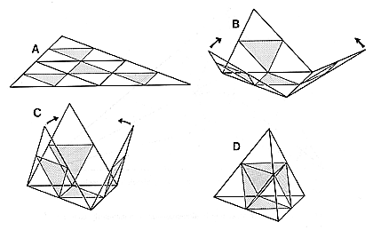 The triangle folded into a tetrahedron inadvertently describes the four exposed faces of the tetrahedron’s internal octahedron. (See Fig. 100.416 A-D.)