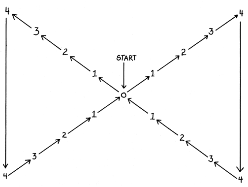 Applying the Indig-Numerology to the multiplication tables, this wave phenomenon reappears dramatically, with each integer having a unique operational effect on other integers. For instance, you look at the total multiplication patterns of the prime numbers three and five and find that they make a regular X. The foumess ( = + 4) and the fiveness ( = - 4) are at the positive-negative oscillation center; they decrease and then increase on the other side where the two triangles come together with a common center in bow-tie form. You find that the sequences of octaves are so arranged that the common ball can be either number eight or it could be zero or it could be one. That is, it makes it possible for waves to run through waves without having interference of waves. (See drawings section.)
