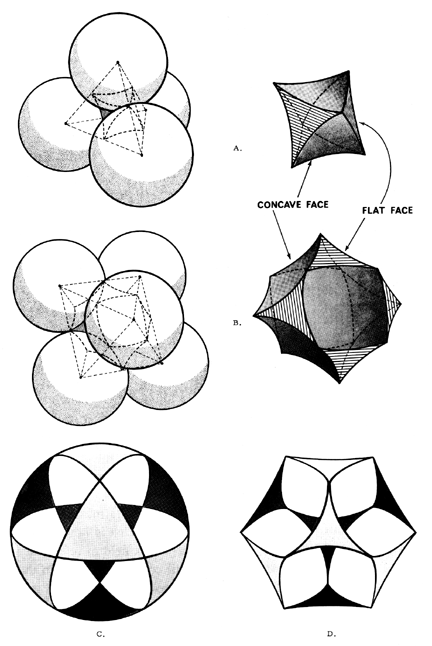 Fig. 1032.12 Convex and Concave Sphere Packing Voids: A. In a tetrahedron composed of four spheres, the central void is an octahedron with four concave spherical triangular faces and four planar triangular faces with concave sides. This can be described as a “concave octahedron.” B. In an octahedron composed of six close-packed spheres, the central void is a vector equilibrium with six concave spherical square faces and eight triangular faces with concave sides: a “concave vector equilibrium.” C. The vector equilibrium with edges arced to form a sphere: a convex vector equilibrium. D. The vector equilibrium with arcs on the triangular faces defined by spheres tangent at vertexes: a concave vector equilibrium.