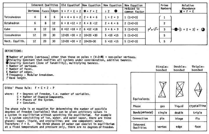Synergetic Analysis: Euler’s topology and Willard Gibbs’ phase rule give us synergetic-analysis capability. Euler differentiated all physical Universe into lines, crossings, and areas: the fundamental visual aspects of our experiences having to do with our eyes, radiation frequencies, and conceptual images. Gibbs’ phase rule differentiated the physical Universe into liquid, crystalline, and gaseous phases, which are not so much visual as thermal, which is tactile, and which are always characterized by unique whole- number interattractions, i.e., restraints. Conversely, with successive whole-number degrees of freedom, thermal, sonic, or viscosity frequencies are differentiated in respect to their condition within their respective states as well as between those states.