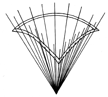Let us now gather together all the equally down-extending lengths of rod ends to one point. The Greeks defined a sphere as a surface equidistant in all directions from one point. All the points where the rods penetrate the steel triangle edges or the three-way-intersecting elastic rubber-band grid will be equidistant from one common central point to which the rod ends are gathered__and thus they all occur in a spherical, triangular portion of the surface of a common sphere__specifically, within the lesser surfaced of the two spherical triangles upon that sphere described by the steel arcs. Throughout the transformation, all the rods continue their respective perpendicularities to their respective interactions of the three-way crossings of the flexible grid lines of the basic steel triangle’s inherently completable surface.