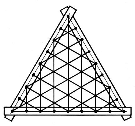 The rubber bands will be strung in such a way that every point along the steel triangle mid-edge line penetrated by the rods shall act as an origin, and every second point shall become also the recipient for such a linking as was described above, because each side feeds to the other sides. The “feeds” must be shared at a rate of one goes into two. Each recipient point receives two lines and also originates one; therefore, along each edge, every point is originating or feeding one vertical connector, while every other, or every second point receives two obliquely impinging connector lines in addition to originating one approximately vertically fed line of connection.