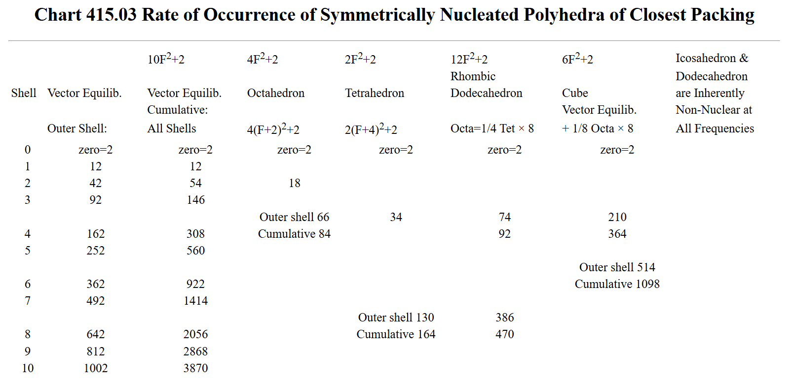 - The concentrically embracing shells of the vector equilibrium have a successive population growth rate of 10F² + 2, resulting in 12 spheres in the first layer, in the second, 92 in the third, and 162 in the fourth. (See Chart 415.03.)