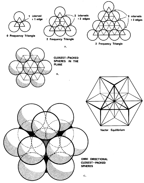 Over and over again, we are confronted by nature obviously formulating her structures with beautiful spherical agglomerations. The piling of oranges, coconuts, and cannonballs in tetrahedral or half-octahedral pyramids has been used for centuries and possibly for ages. Almost a half-century ago, F. W. Aston, the British scientist first identified for physics the most economical uniradius spherical interagglomerations as the “closest packing of spheres,” which had fresh interest for the physicist and crystallographer because of the then recently discovered microscopic realization that nature frequently employed omni-intertriangulated systems, which hold mathematical clues to the principles of symmetrical coordination governing natural structure, the dynamic vectorial geometry of the atomic nucleus, as well as of the atoms themselves.