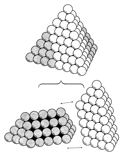 The South Seas islander piling his coconuts, the fruit dealer selling oranges, and the cannoneer stacking equiradius cannonballs, or the much earlier round-rock- slinging soldiers were probably the first to learn about the closest packing of spheres. The stacking of balls in symmetrical rows and layers leads inevitably to a stable pyramidal aggregate.