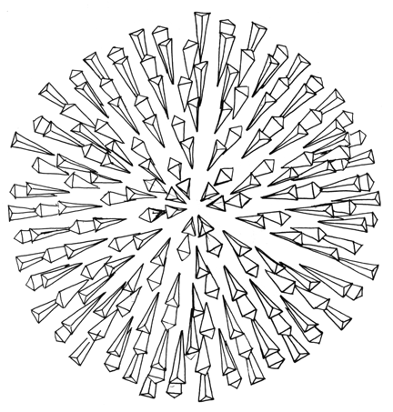 Circular cornucopia can be tangentially assembled around interior points to form a “spherical bouquet,” a spherical array, but the tangent circle areas do not constitute the total surface of the sphere. There are concave triangle interstices (see Fig. 541.30H).