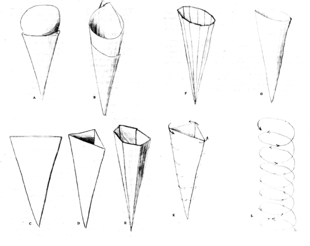 But three-sided, triangle-mouthed cornucopia will, together, subdivide the total sphere (see Fig. 541.30I). Therefore, as the three-sided tetrahedral packages become outwardly separated from one another, they will inherently yield to their greater volume and, being spun precessionally (Fig. K) by their sum-total cosmic otherness, will, by centrifugal force, become cones; which, rotating on their long conic axis will generate a cylindrical, spiral, wave pattern: (Fig. L). By their radially outward dispatch, they rotationally describe the cornucopia, or cone of gradual beam spread—the spread rate being negligible in relation to the axial speed-of-light rate of travel (See Fig. 541.30M).