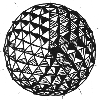 Fig. 541.30H Circular Cornucopia Assembled Around Interior Points to Form a Spherical Array. The tangent circles areas as well as concave triangle interstices constitute the total spherical surface.