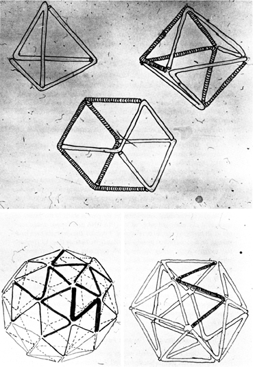The tetrahedron, octahedron, and icosahedron are made up, respectively, of one, two, and five pairs of positively and negatively functioning open triangles.