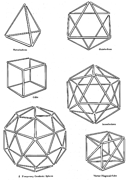 Because of the structural integrity of the blackboard or paper on which they may be schematically pictured, the cubically profiled form can exist, but only as an experienceable, forms-suggesting picture, induced by lines deposited in chalk, or ink, or lead, accomplished by the sketching individual with only 12 of the compression- representing strut edge members interjoined by eight flexible vertex fastenings.