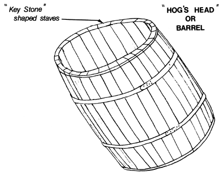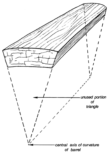 The barrel represents an advanced phase of the Roman arch principle of stability accomplished by simple (approximately) single-axis curvature. A barrel is comprised of a complete ring around one axis of a number of parallel staves. A cross section cut through the barrel perpendicular to its single axis of curvature shows each of the stave’s sections looking like keystones in an arch. Each stave is a truncated section of a triangle whose interior cutaway apex would be at the center of the barrel. The staves employ only the outer trapezoidal wedge-shaped cross section, dispensing with the unnecessary inner part of the triangle. The stave’s cross section is wedge-shaped because the outer edge of the stave is longer than the inner edge of the stave. Because the stave’s outer-circle chord is longer than its inner-circle chord, it cannot fall inwardly between the other staves and it cannot fall outwardly from close-packed association with the other staves because they are all bound inwardly together by the finitely closed barrel “hoops” of steel.