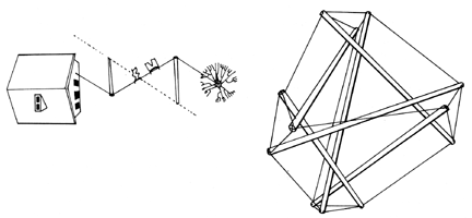 Surprising behaviors are found in tensegrity structures. The illustration shows a house and a tree and a clothesline. The line hangs low between the house and the tree. To raise the line so that the clothes to be dried will not sweep the ground, the line is elevated by a pole that has one end thrust against the ground and the other end pushed outwardly against the line. The line tightens with the pole’s outer end at the vertex of an angle stretched into the line. The line’s angle shows that the line is yielding in the direction away from the thrusting pole.