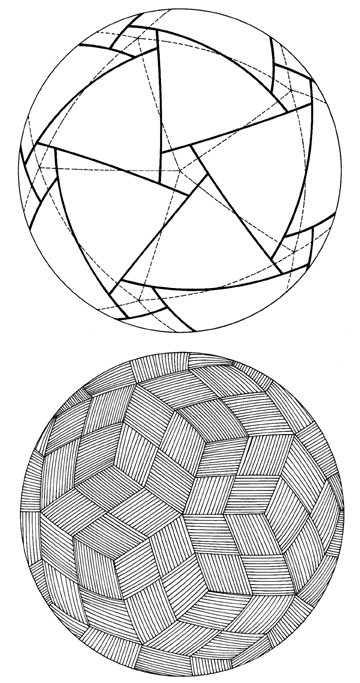 Fig. 770.11 System Turbining in Tensegrity Structures: A. The two above both have six axes of symmetry. It is the patterning of the thirty diamond domains of the icosahedron’s thirty edges, the rhombic triacontahedron. B. The linear-congruence juncture of two positive or two negative turbining-surface three-strut tensegrity units. C. Single-bonded tensegrity: turbining tendencies of thrusts of C about A and B are additive. D. Double-bonded tensegrity: turbining tendencies of thrusts of C about A are opposed to those about B.