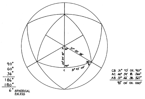 In reducing 120 spherical triangles described by the 15 great circles to planar faceted polyhedra, the spherical excess 6° would be shared proportionately by the 90°-60°-30° flat relationship = 3:2:1.