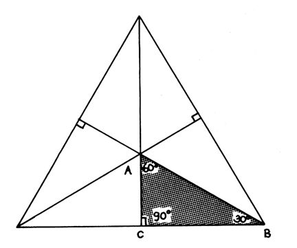 Subdivision of Equilateral Triangle: Both the spherical and planar equilateral triangles may be subdivided into six equal and congruent parts by describing perpendiculars from each vertex of the opposite face. This is demonstrated in Fig. 902.01, where one of the six equal triangles is labeled to correspond with the Basic Triangle in the planar condition.