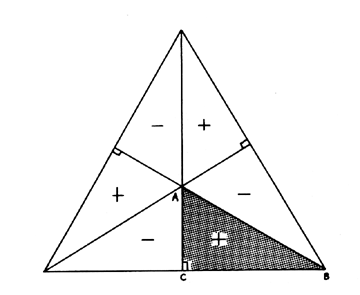 Positive and Negative Alternation: The six equal subdivision triangles of the planar equilateral triangle are hingeable on all of their adjacent lines and foldable into congruent overlays. Although they are all the same, their dispositions alternate in a positive and negative manner, either clockwise or counterclockwise.