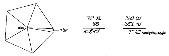 We know that the edge angle of a tetrahedron is 70° 32’, and five times that is 352° 40’, which is 7° 20’ less than 360°. In other words, five tetrahedra around a common edge axis do not close up and make 360 degrees, because the dihedral angles are 7° 20’ short. But when they are brought together in a helix—due to the fact that a hinged helix is a coil spring—the columns will twist enough to permit the progressive gaps to be closed. No matter how long the tetrahelix columns are, their sets of coil springs will contract enough to bring them together. The backed-up spring tries constantly to unzip one nesting tetrahedron from the others of which it is a true replica. These are only synergetical conjectures as to the theoretical explanations of otherwise as yet unexplained behaviors of the DNA.