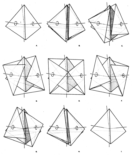 Fig. 938.16 Octahedron Produced from Precessed Edges of Tetrahedron: An octahedron may be produced from a single tetrahedron by detaching the tetra edges and precessing each of the faces 60 degrees. The sequence begins at A and proceeds through BCD at arrive at E with an octahedron of four positive triangular facets interspersed symmetrically with four empty triangular windows. From F through I the sequence returns to the original tetrahedron.