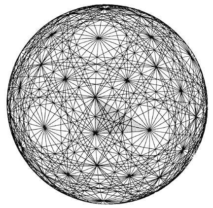 wherein n is the number of system vertexes (or unit radius spheres). A tetrahedron has four vertexes: 4²=16, minus n4 = 12, divided by 2 = 6—i.e., the number of unique vertex interrelationship lines of the minimum structural system—the tetrahedron—is six.