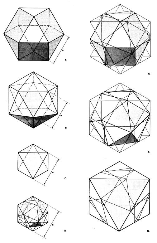 Fig. 988.100 Octa-Icosa Matrix: Emergence of S Quanta Module: A. Vector equilibrium inscribed in four-frequency tetrahedral grid. B. Octahedron inscribed in four-frequency tetrahedral grid. C. Partial removal of grid reveals icosahedron inscribed within octahedron. D. Further subdivision defines modular spaces between octahedron and icosahedron. E. Exploded view of six pairs of asymmetric tetrahedra that make up the space intervening between octa and icosa. Each pair is further subdivided into 24 S Quanta Modules. Twenty-four S Quanta Modules are added to the icosahedron to produce the octahedron.