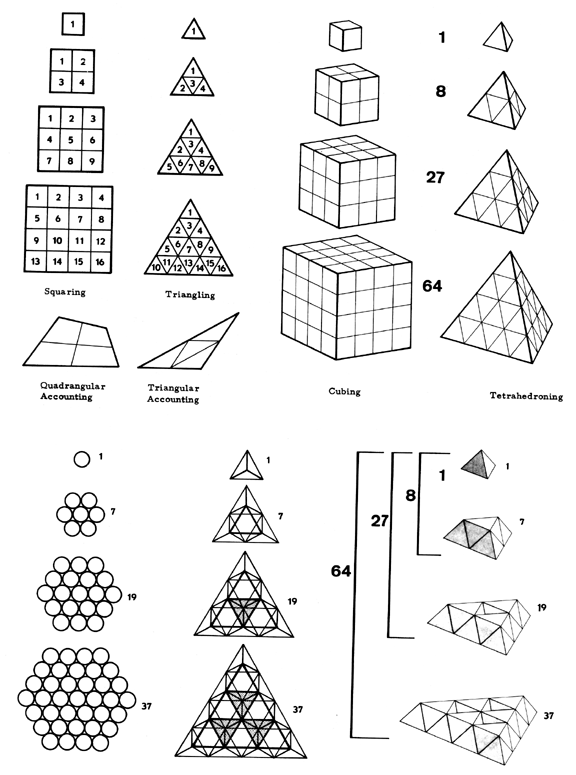 We may now say “one to the second power equals one,” and identify that arithmetic with the triangle as the geometrical unit. Two to the second power equals four: four triangles. And nine triangles and 16 triangles, and so forth. Nature needs only triangles to identify arithmetical “powering” for the self-multiplication of numbers. Every square consists of two triangles. Therefore, “triangling” is twice as efficient as “squaring.” This is what nature does because the triangle is the only structure. If we wish to learn how nature always operates in the most economical ways, we must give up “squaring” and learn to say “triangling,” or use the more generalized “powering.”