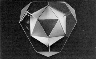 Fig. 100.120 Image of Icosa and Tetra: Photograph of a truncated glass tetrahedron with frosted triangular facets producing an image of clustered tetrahedra that approximate an icosahedron. (See discussion at Sec. 934)
