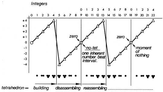 Fig 1012.14A Indig Octave System of Four Positive, Four Negative and Zero-Nine Wave Pattern of Experiential Number: This basic discontinuous wave disclosure is intimately related to inherent octavization through tension-chord halving discovered by the Pythagoreans, and the major-minor-mode “fifthing” obtained by tension-chord thirding of length. These inherent additive-subtractive, alternate pulsing effects of number produce positive waves, but not continuously as had been misassumed. Zero-or “No-tet, None, Nine” intrudes. Waves are discontinuous and confirm unit quantation, one tetrahedron inherently constituting the basic structural system of Universe. The star Sun’s combining of four hydrogen atoms into helium atoms generates quanta radiation.