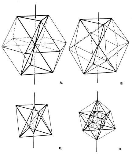Fig. 1033.43 Two Opposite-Paired Tetrahedra Interpenetrate in Jitterbug Contraction: As one axis remains motionless, two polar-paired, vertex-joined tetrahedra progressively interpenetrate one another to describe in mid-passage an octahedron, at C, and a cube-defining star polyhedron of symmetrical congruence at D. (Compare Fig. 987.242A.)