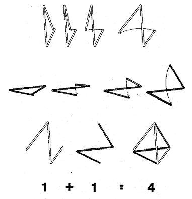 Fig. 108.01 Triangle and Tetrahedron: Synergy (1 + 1 = 4): Two triangles may be combined in such a manner as to create the tetrahedron, a figure volumetrically embraced by four triangles. Therefore one plus one seemingly equals four.