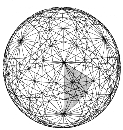Composite of Vector Equilibrium and Icosahedron Great Circle Sets: This is a black-and- white version of color plate 32. The Basic Equilibrium 48 LCD triangle appears here shaded in the spherical grid. In this composite spherical matrix we see all the 25 primary vector equilibrium great circles and two sets skewed-positive and negative of the icosahedron 31 great circle sets. (31 ’ 2 = 62. 62 + 25 = 87. But 14 of the 87 are redundant.) Four of the VE great circles are congruent with four of the icosa’s 10-great circle set. Three of the VE great circles are congruent with three of the icosa’s 15-great- circle set. Thus seven positive are redundant and seven negative are redundant. (87__14=73.) There are 73 great circles in the composite set. (See color plate 32.) This composite shows the vector equilibrium great circles and the icosahedron great circles in the two alternate ways of pumping the VE jitterbug pattern.