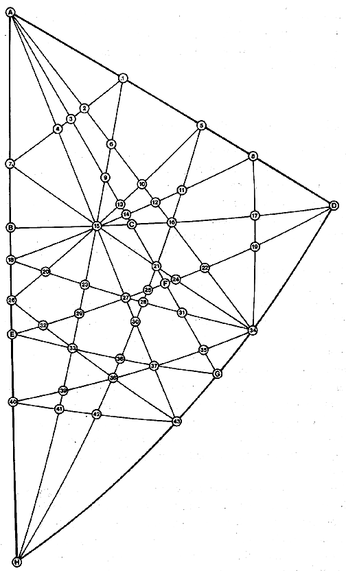 Net Diagram of Angles and Edges for Basic Equilibrium 48 LCD Triangle in VE-icosa Grid: This is a coded detail of the basic spherical triangle shown shaded in Fig. 1132.01B and at Fig. 453.01. It is the key to the trigonometry tables for the spherical central angles, the spherical face angles, the planar edge lengths, and the planar face angles presented at Table 1132.01D. (The drawing shows the spherical phase: angle and edge ratios are given for both spherical and planar VE.)