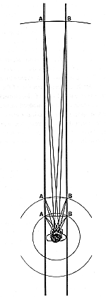 Fig. 260.211 Humans’ Range-finding Optical System: Our two eyes form the baseline of an isosceles triangle and seek to discern the convergent angle at the opposite object apex: for instance, tracks A or B, with the distance between A and B constant. Farther away they become shorter chords of ever larger circles and finally appear to be congruent.