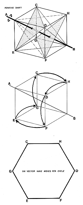 Fig. 464.01 Triangle in Cube as Energetic Model: The rotating shaft is labeled AB. The model demonstrates that there are six vector moves per cycle.