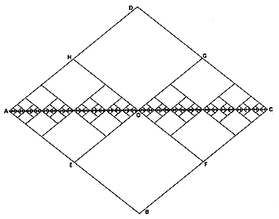 Fig. 522.09 The Deliberately Nonstraight Line: Quasi-”straight” lines: ABCDA = unit wave; AEOFCGOHA = ABCDA. As we double the frequency and halve the wavelength of positive and negative waves, we approach relative straightness: proof that two deliberately nonstraight lines between points A and C approach relative straightness to more effective degree than attainable by an assumed straight construction.