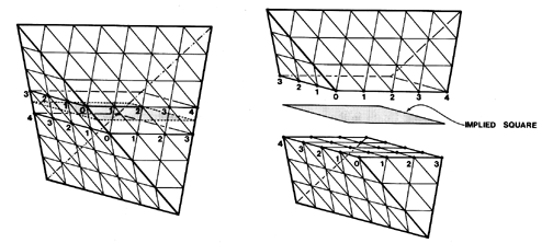 Fig. 527.08 Assembly by Convergence and Divergence: A regular tetrahedron may be divided into two identical halves by an implied square section. The two halves may be separated and reassembled by precessional rotation. This is an illustration of rotational symmetry. (See Fig. 417.01 and Loeb Contribution L.) For other examples of the evolution of “Chef’s Cap” polyhedra, see Figs. 100.103 and 987.23B.