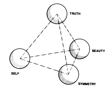 Fig. 542.02 Tetrahedral Analysis of Plato’s Triad: The triadic concept of Beauty, Symmetry, and Truth inadvenently omitted the function of the observer. The tetrahedron is the unique symmetrical set of minimum interrelationships.
