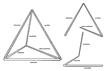Fig. 620.06 Tetrahedron as Vectorial Model of Quantum: The tetrahedron as a basic vectorial model is the fundamental structural system of the Universe. The open-ended triangular spiral as action, reaction, and resultant (proton, electron, and anti-neutrino; or neutron, positron, and neutrino) becomes half quantum. An association of positive and negative half-quantum units identifies the tetrahedron as one quantum.