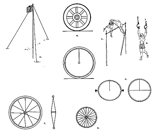 E. The wire wheel provides a series of tension clings. The axle load of the wire wheel is hung from the top of the wheel, which tries to belly out, so spokes as additional tension members are added horizontally to keep it from bellying.