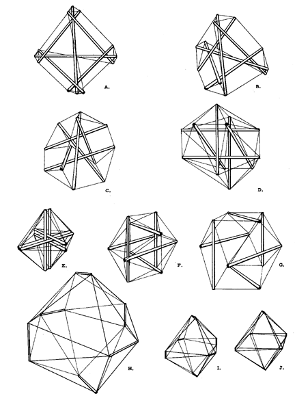 Fig. 725.02 Transformation of Six-Strut Tensegrity Structures: A six-strut tensegrity tetrahedron (A) can be transformed by changing the distribution and relative lengths of its tension members (B, C) to the six- strut icosahedron (D). A theoretical three-way coordinate expansion can be envisioned with three parallel pairs of constant-length struts in which a stretching of tension members is permitted as the struts move outwardly from a common center. Starting with a six-strut octahedron (E), the structure expands outwardly going through the icosahedron phase (F) to the vector-equilibrium phase (G). When the structure expands beyond the vector equilibrium, the six struts become the edges of figure H. They consequently lose their structural function (assuming the original distribution of tension and compression members remains unchanged). As the tension members become substantially longer than the struts, the struts tend to approach relative zero and the overall shape of the structure approaches a super octahedron (I, J).