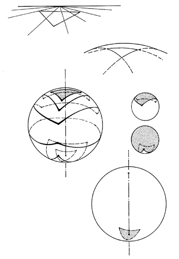 Fig. 812.03: The Greeks defined a triangle as an area bound by a closed line of three edges and three angles. A triangle drawn on the Earth’s surface is actually a spherical triangle described by three great- circle arcs. It is evident that the arcs divide the surface of the sphere into two areas, each of which is bound by a closed line consisting of three edges and three angles, ergo dividing the total area of the sphere into two complementary triangles. The area apparently “outside” one triangle is seen to be “inside” the other. Because every spherical surface has two aspects_convex if viewed from outside, concave if viewed from within_each of these triangles is, in itself, two triangles. Thus one triangle becomes four when the total complex is understood. “Drawing” or “scribing” is an operational term. It is impossible to draw without an object upon which to draw. The drawing may be by depositing on or by carving away, that is, by creating a trajectory or tracery of the operational event. All the objects upon which drawing may be operationally accomplished are structural systems having insideness and outsideness. The drawn-upon object may be symmetrical or asymmetrical, a piece of paper or a blackboard system having insideness and outsideness.