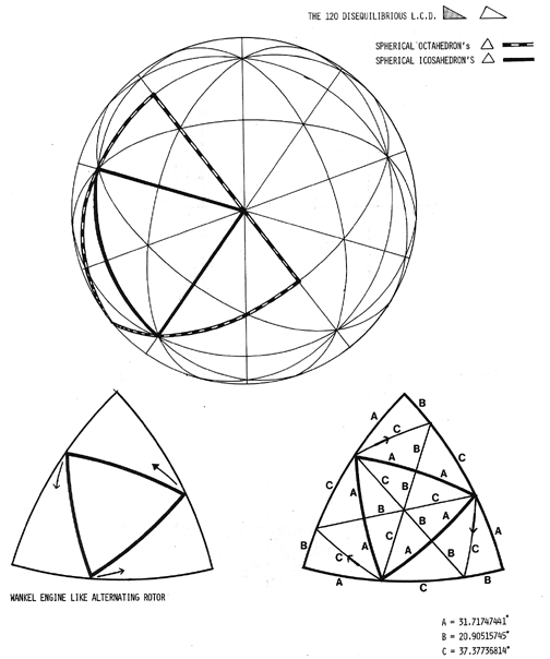 In reducing 120 spherical triangles described by the 15 great circles to planar faceted polyhedra, the spherical excess 6° would be shared proportionately by the 90°-60°-30° flat relationship = 3:2:1.