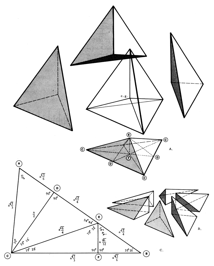 - B. The quarter-tetrahedron is divided into six identical irregular tetrahedra, which appear as three right-hand and three left-hand volumetric units each equal in volume to 1/24th of the original tetrahedron. This unit is called the A Module.