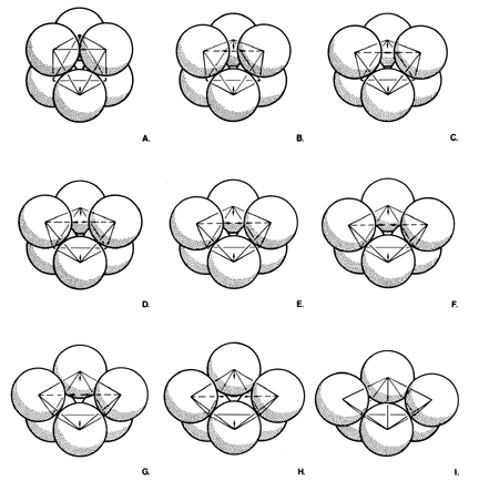 Fig. 936.12 Octahedron as Conservation and Annihilation Model: If we think of the octahedron as defined by the interconnections of six closest-packed spheres, gravitational pull can make one of the four equatorial vectors disengage from its two adjacent equatorial vertexes to rotate 90 degrees and rejoin the north and south vertexes in the transformation completed as at I. (See color plate 6.)