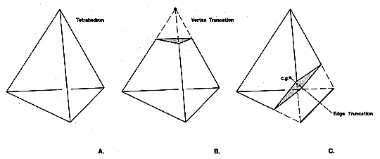 Fig. 986.061 Truncation of Tetrahedra: Only vertexes and edges may be truncated. (Compare Figs. 987.241 and 1041.11.)