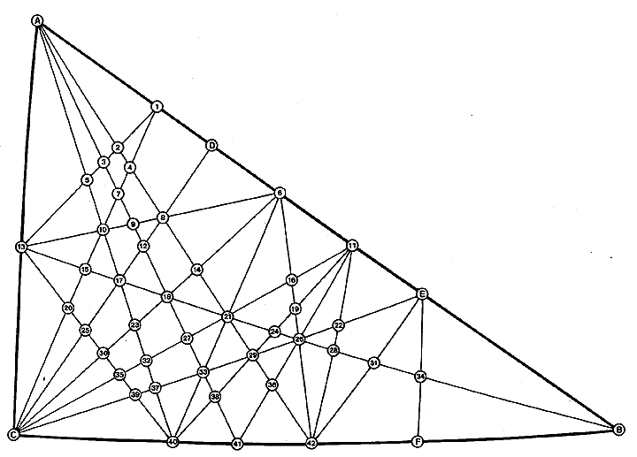 Fig. 987.132F Net Diagram of Angles and Edges for Basic Disequilibrium 120 LCD Triangle: This is a detail of the basic spherical triangle shown shaded in Fig. 987.132E and at Fig. 901.03. It is the key to the trigonometric tables for the spherical central angles, the spherical face angles, the planar edge lengths, and the planar face angles presented at Table 987.132G.