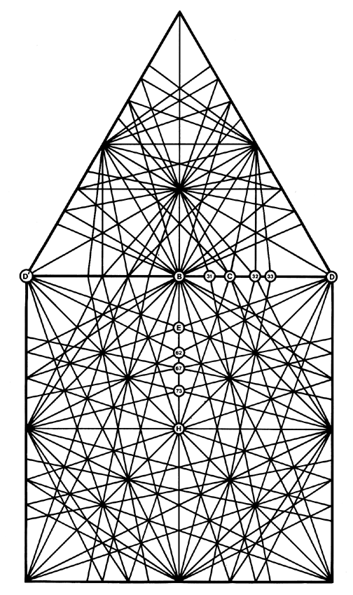 Fig. 987.412 Rational Fraction Edge Increments of 60-degree Great-circle Subdividings of Vector Equilibrium: When these secondary VE great-circle sets are projected upon the planar VE they reveal the following rational fraction edge increments: