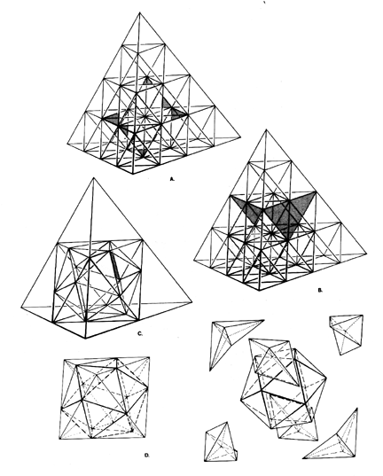 E. Exploded view of six pairs of asymmetric tetrahedra that make up the space intervening between octa and icosa. Each pair is further subdivided into 24 S Quanta Modules. Twenty-four S Quanta Modules are added to the icosahedron to produce the octahedron.