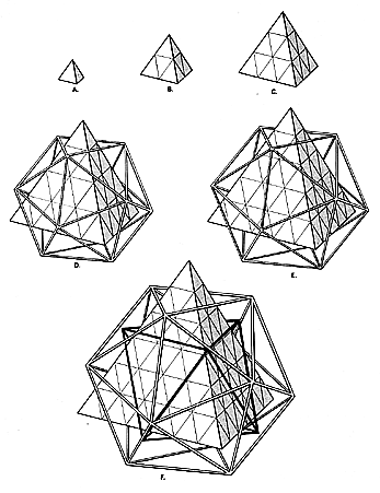 Fig. 995.03 Vector Models of Atomic Nuclei: Magic Numbers: In the structure of atomic nuclei there are certain numbers of neutrons and protons which correspond to states of increased stability. These numbers are known as the magic numbers and have the following values: 2, 8, 20, 50, 82, and 126. A vector model is proposed to account for these numbers based on combinations of the three fundamental omnitriangulated structures: the tetrahedron, octahedron, and icosahedron. In this system all vectors have a value of one-third. The magic numbers are accounted for by summing the total number of vectors in each set and multiplying the total by 1/3. Note that although the tetrahedra are shown as opaque, nevertheless all the internal vectors defined by the isotropic vector matrix are counted in addition to the vectors visible on the faces of the tetrahedra.