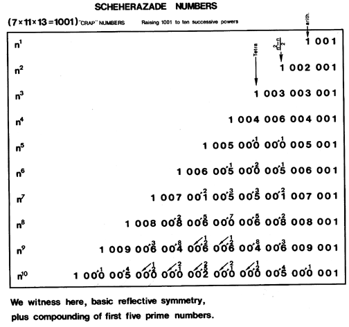 Cancellation of “Leftward Spillover” to Disclose Basic Reflection Symmetry of Successive Powers of the Scheherazade Numbers: Raising 1001 to ten successive powers, we recognize basic reflective symmetry plus compounding of five basic primes. 7 × 11 × 13 = 1001.